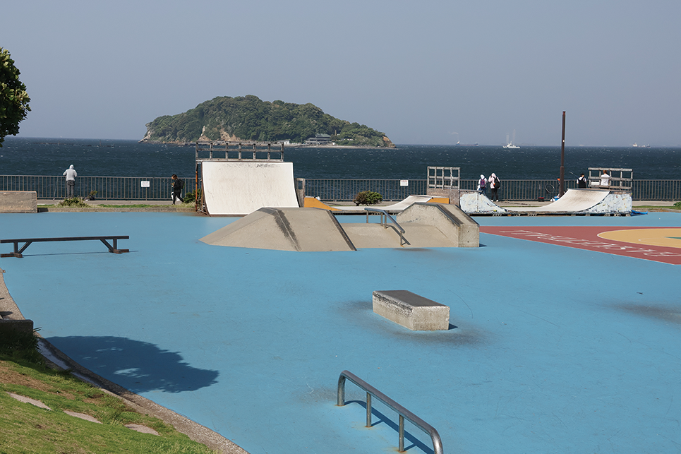 猿島が⽬前に迫り、浦賀⽔道を航⾏する船舶を⼀望できる眺望が魅⼒。スケートボードエリアなどのスポーツ施設やバーベキューが楽しめる広場などがある。